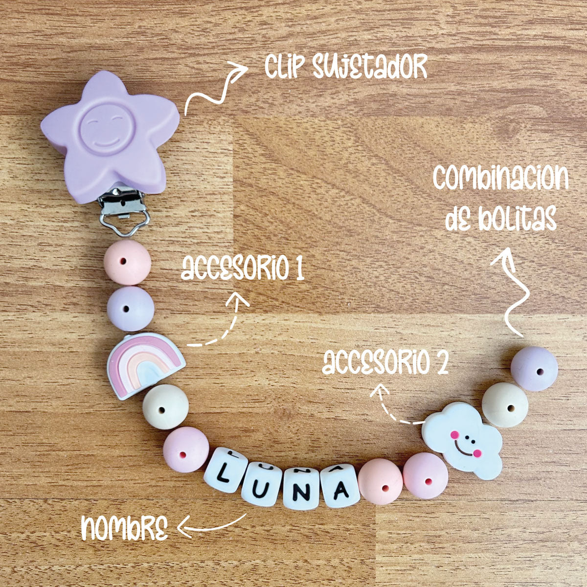 Son completamente seguros para el bebé, están realizados con un cordón llamado "cola de ratón" que no se rompe, lo cual descarta por completo la posibilidad de que el bebé mientras este mordiendo el sujetador se suelten las bolitas.